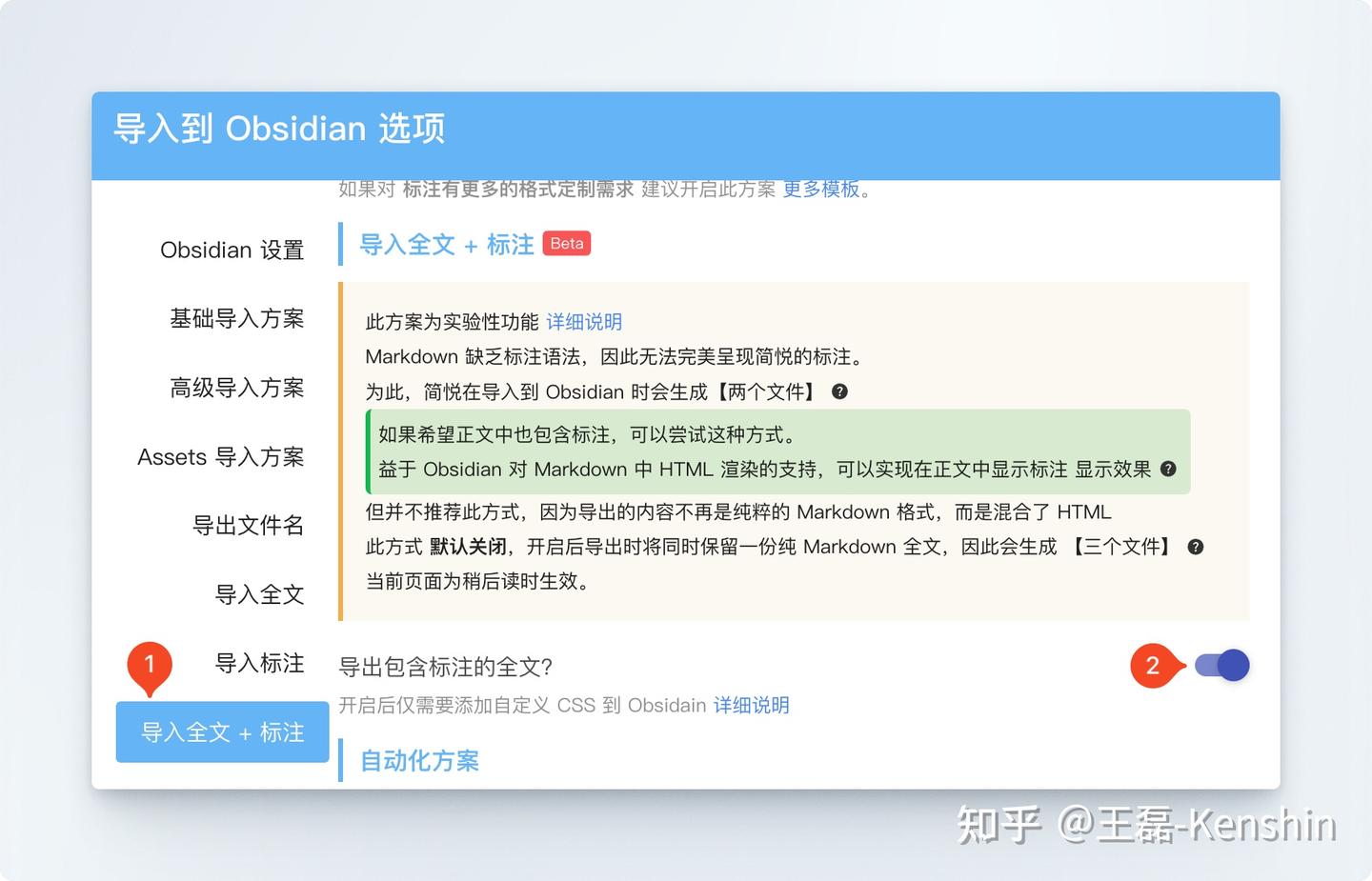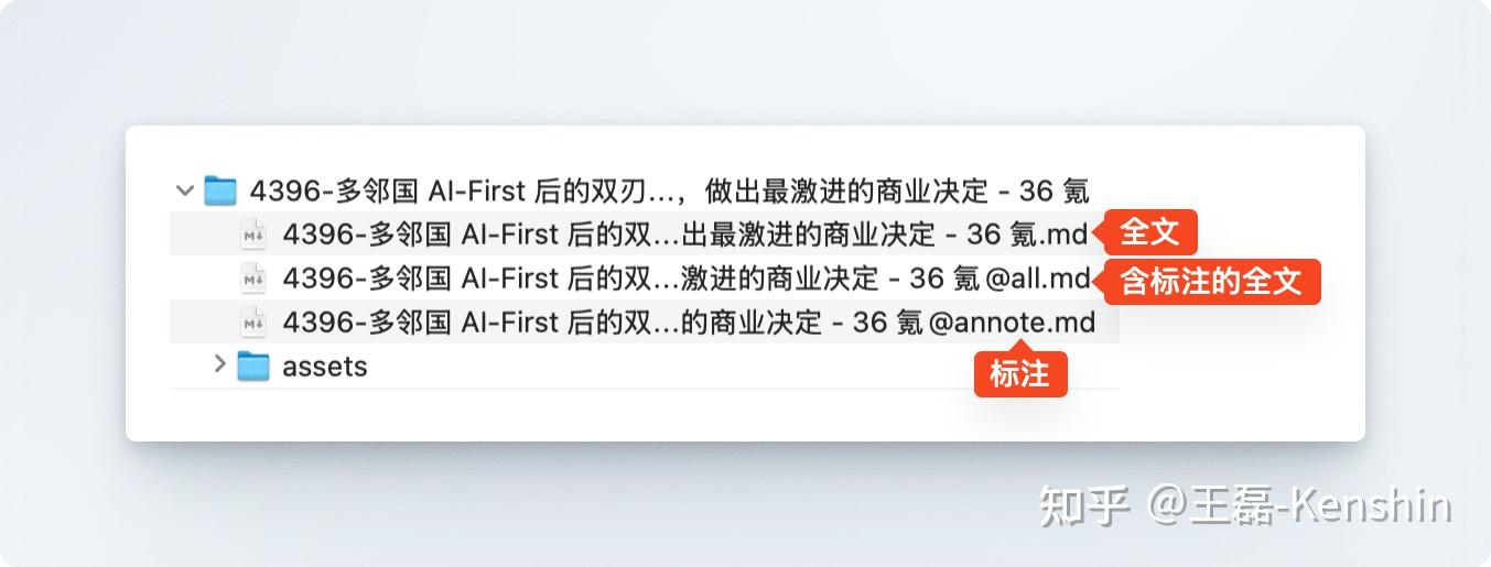 因为导出的内容不再是纯粹的 Markdown 格式,而是混合了 HTML,此方式「默认关闭」,开启后导出时将同时保留一份纯 Markdown 全文,因此会生成三个文件: 原文 · 带有标注的全文 · 标注