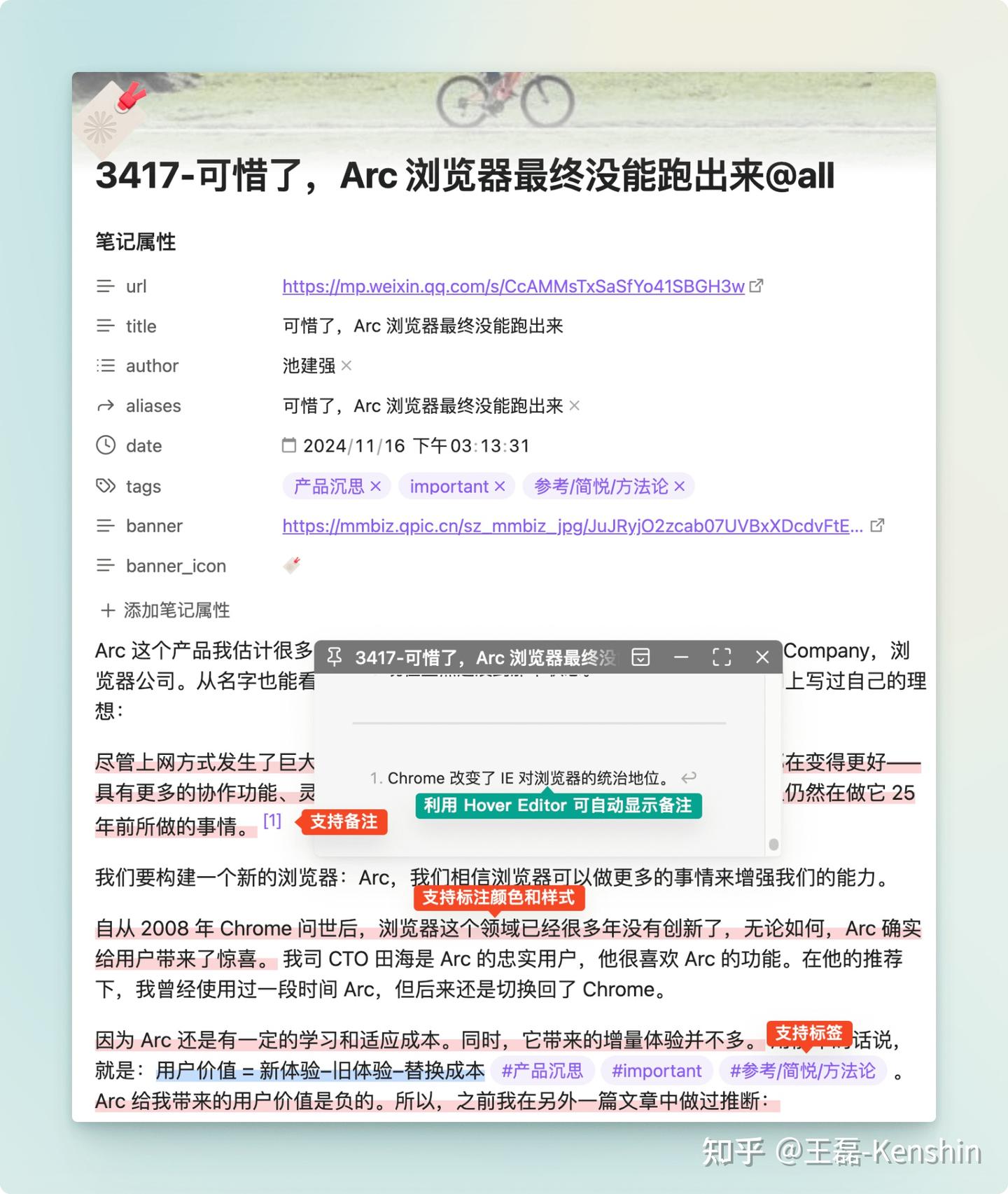 Markdown 缺乏标注语法,因此无法完美呈现简悦的标注,得益于 Obsidian 对 Markdown 中 HTML 渲染的支持,可以实现在正文中显示标注。